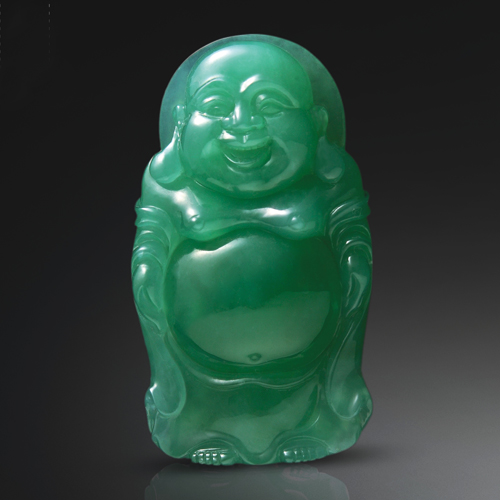笑臉立佛,滿綠冰潤,腹部渾圓飽滿,熒光內蘊。